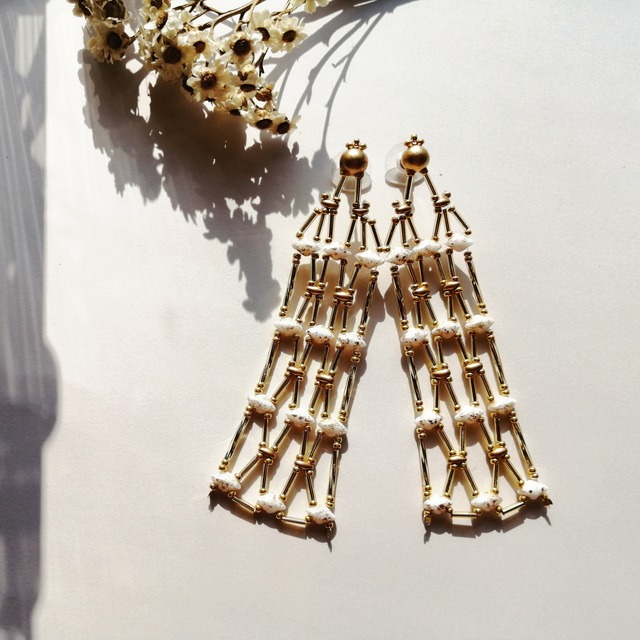野を舞う蝶の可愛らしい様子から インスパイアされた ガラスのガーデンジュエリーです。 マットホワイトカラー ---------------------------------------------------------------- Magic Butterfly Long 素材:ボヘミアンガラスビーズ(US)、淡水パール、テグス、合金 タイプ:ピアス/イヤリング/金属アレルギー対応14kgfピアス 長さ:10cm