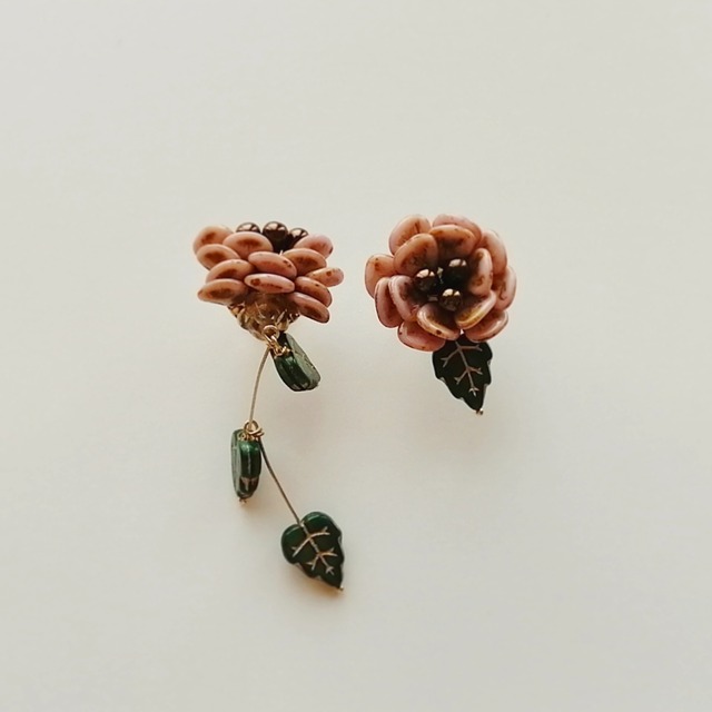 庭の女王芍薬の 凛とした姿に魅了され生まれた アシンメトリータイプのガーデンジュエリーです。 U.S.チェコより仕入れた ボヘミアンビーズを使用しています。 イヤリングは イヤーカフのようにして ご着用いただくことも可能です。(画像参照) アンティーク感のある くすみ系のローズカラーは、 オールシーズンお楽しみいただける 万能カラーです。 --------------------------------------- Blooming Antique Rose 素材:ボヘミアンガラスビーズ(US)/合金/テグス タイプ:ピアス/イヤリング/14kgfピアス 重さ:ショート6g / ロング8g 長さ:6.5cm