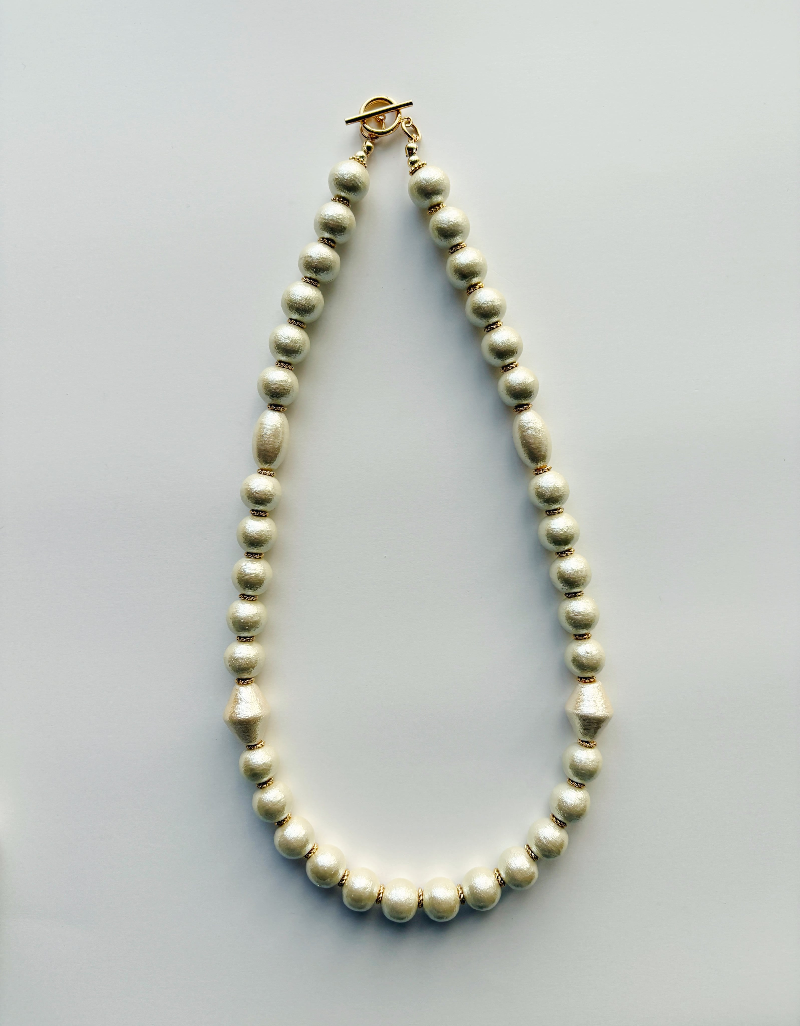 クリームホワイトの艶と、形の違う粒を組み合わせたデザインは