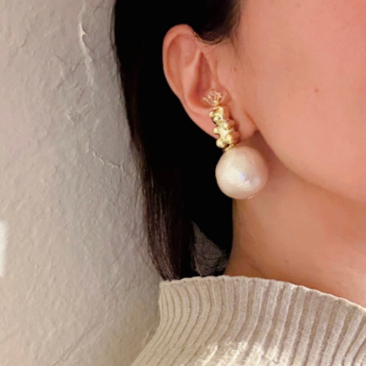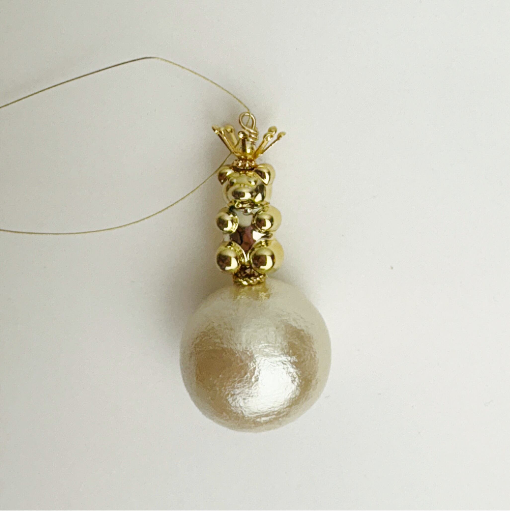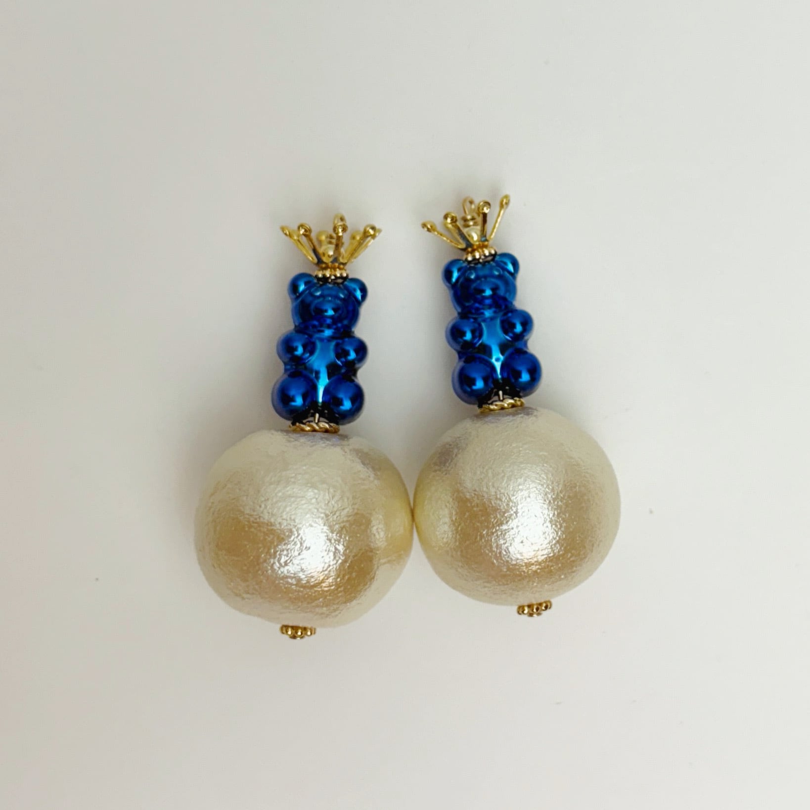 大玉のコットンパールに小さな熊が乗った耳飾り。