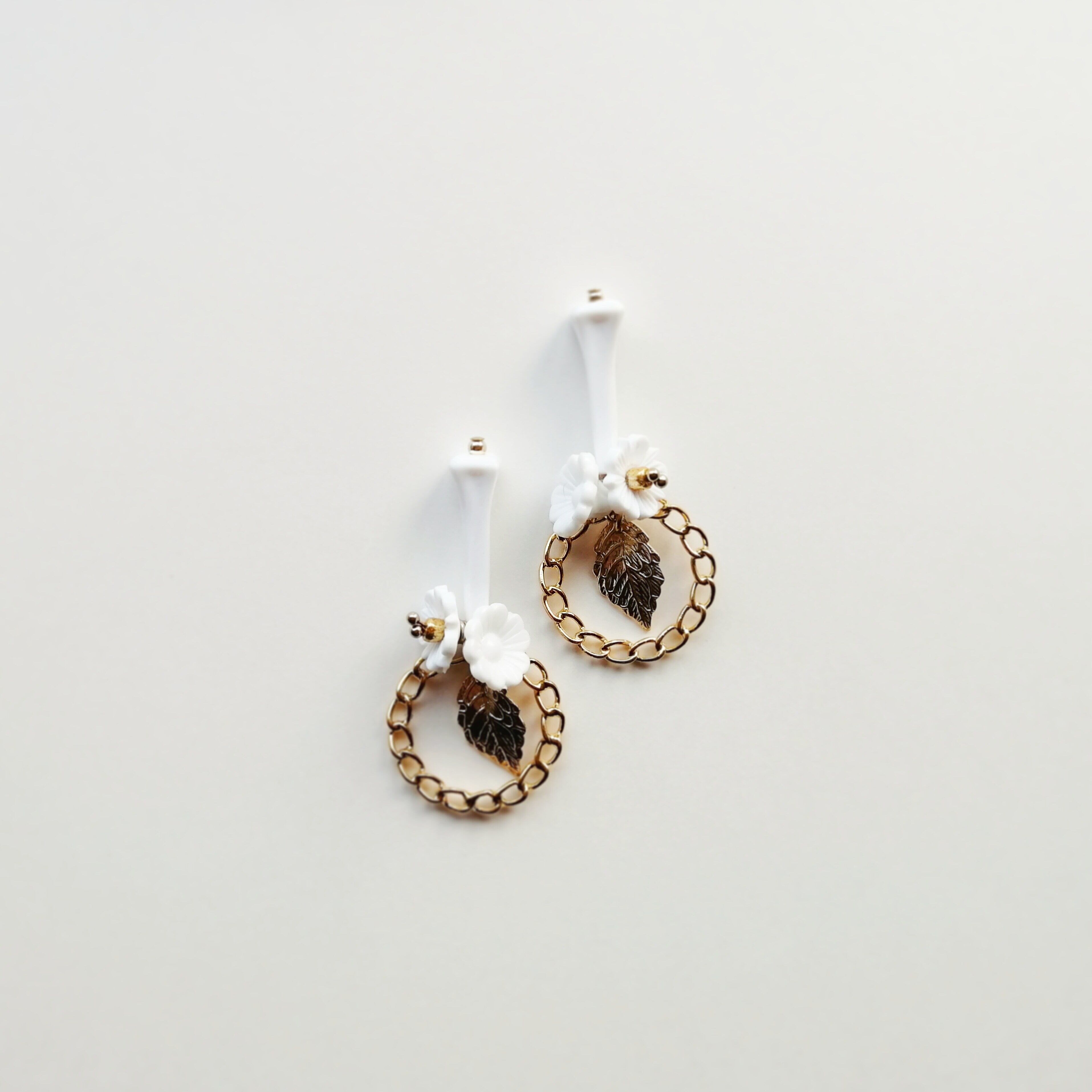 デッドストックのリーフパーツをフープ内に配したイヤリングです。